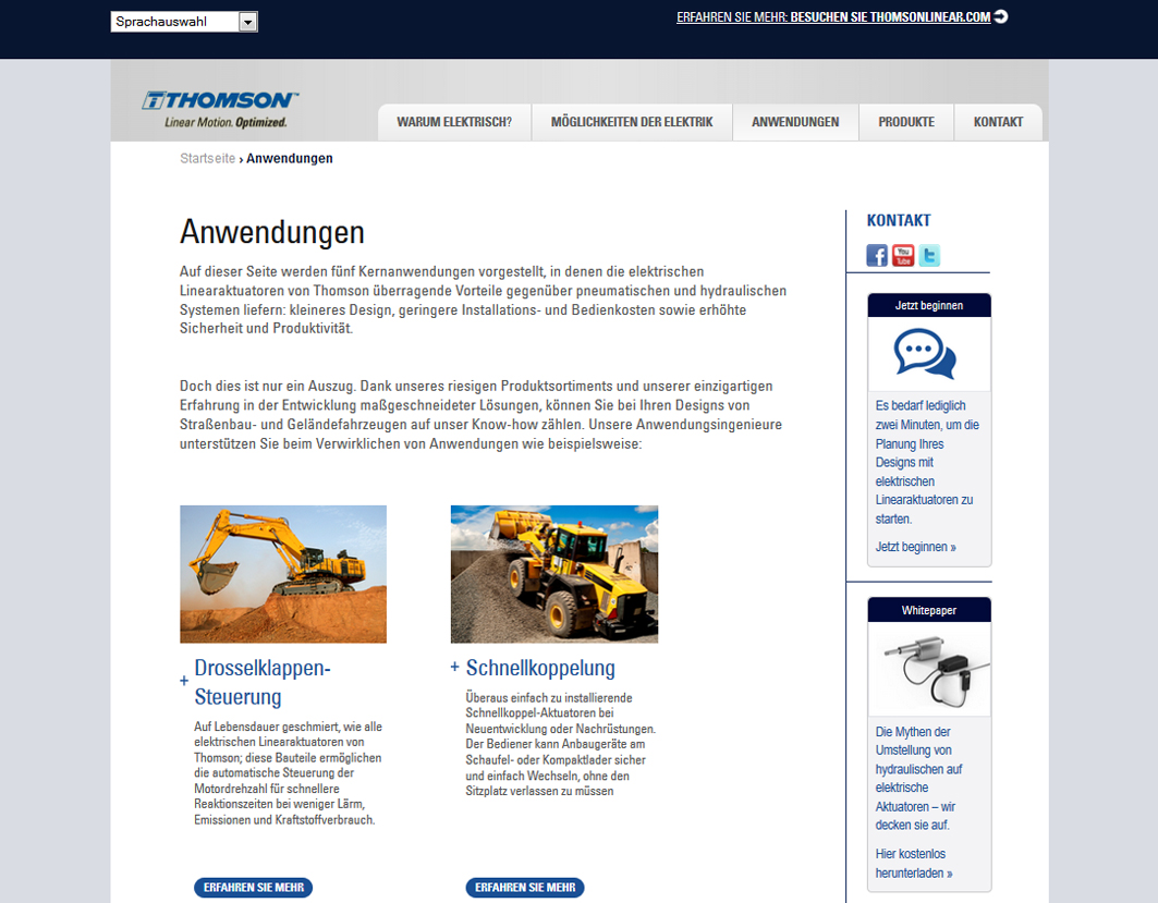 Zur Aufbereitung dieser neuen Informationsquelle griff Thomson auf seine umfassenden Kenntnisse in diesem Bereich zurück. Die in Deutsch, Englisch und Chinesisch verfügbare Microsite zeigt im Detail, inwiefern elektromechanische Lösungen in mobilen Arbeitsmaschinen für Baustellen, Straßenreparaturen, die Land- und Forstwirtschaft oder im Garten- und Landschaftsbau signifikant niedrigere Betriebskosten ermöglichen, den Planungs- und Montageaufwand reduzieren sowie zu mehr Sicherheit für den Bediener und zur Produktivität beitragen.